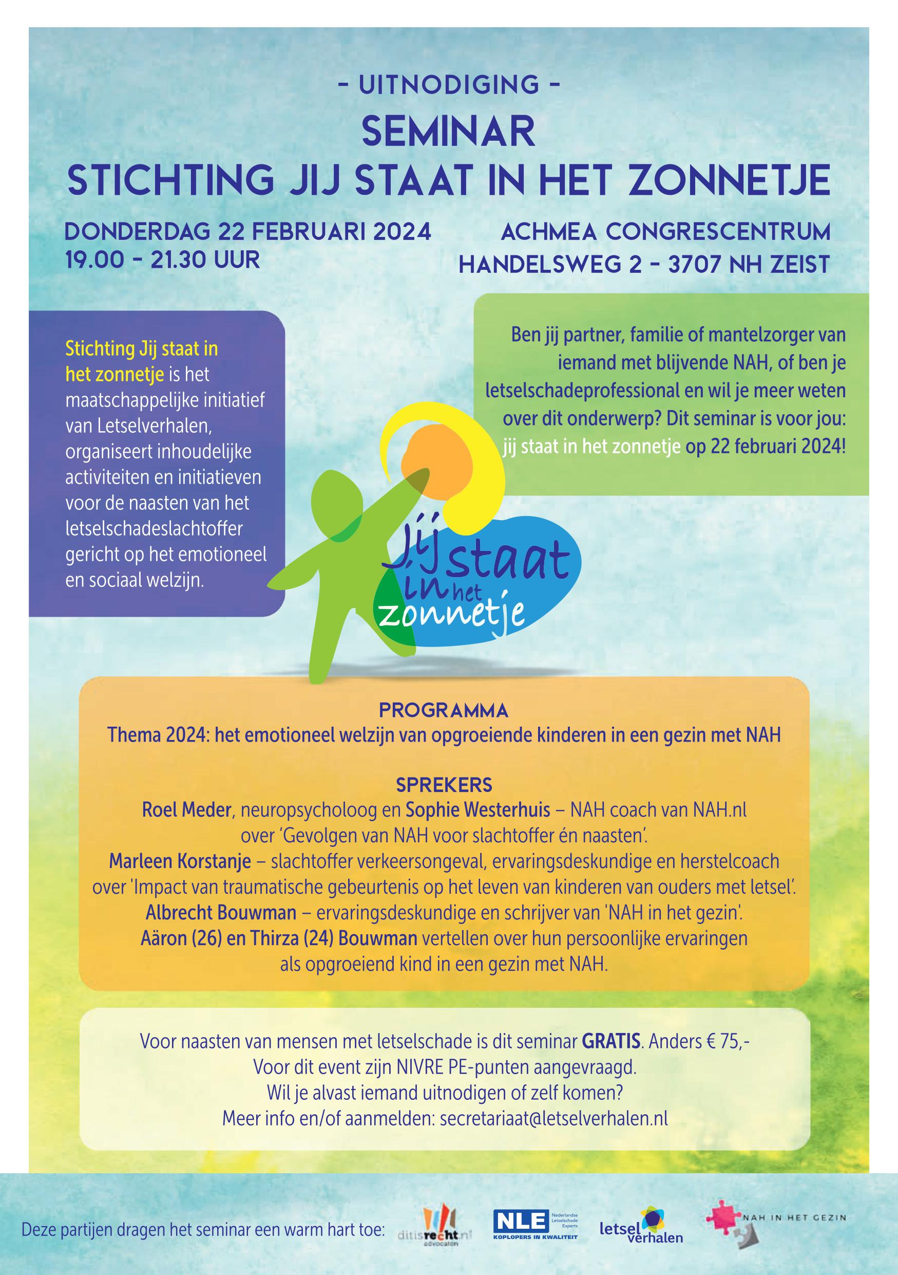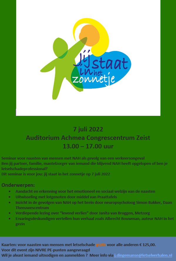 Op 22 februari 2024 bent u van harte welkom op het seminar Jij staat in het zonnetje! Dit seminar is bedoeld voor naasten van letselschadeslachtoffers. Het thema voor deze avondbijeenkomst is NAH in het gezin. We hebben weer een interessant en leerzaam programma vastgesteld. U kunt deze bijeenkomst gratis bijwonen. Bijeenkomst 19.00 – 21.30 uur, locatie ACHMEA congrescentrum, Handelsweg Zeist. Wilt u uzelf aanmelden, dan kan via secretariaat@letselverhalen.nl. Wilt u de bijeenkomst bijwonen en PE-punten behalen, dan bedraagt de toegang € 75.