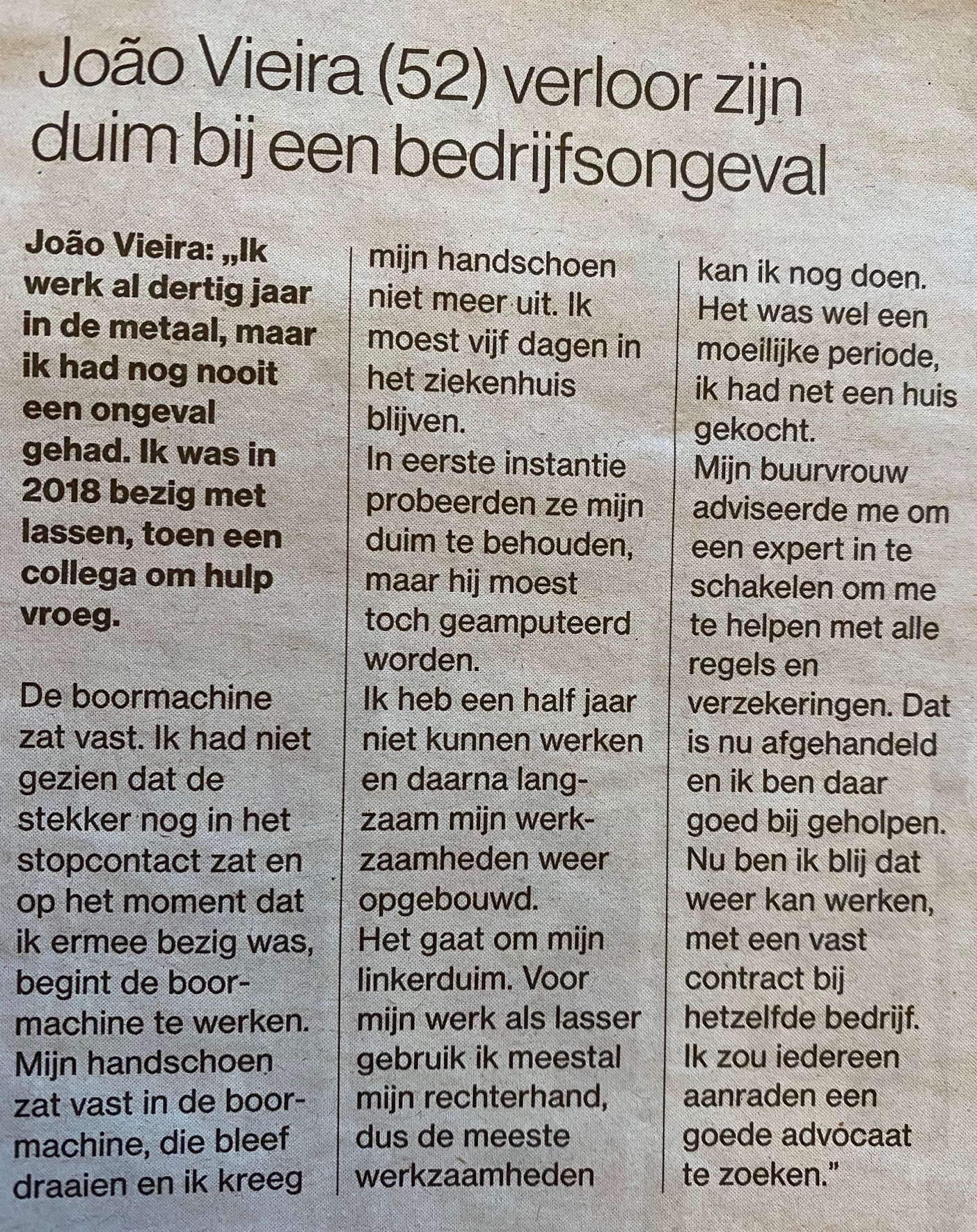 Joao (52) verloor zijn duim bij een bedrijfsongeval. “Ik werk al dertig jaar in het metaal, maar ik had nog nooit een ongeval gehad”.